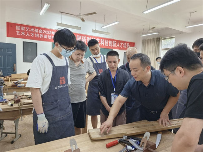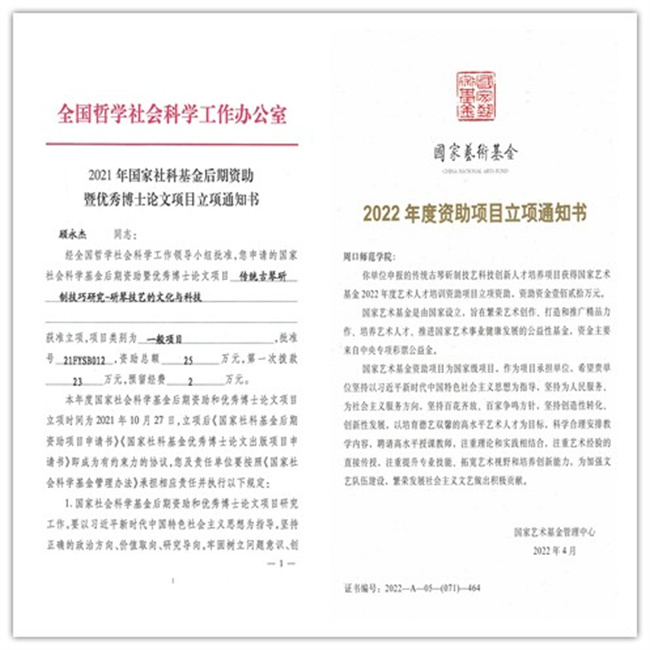 “凝練題目”“擴(kuò)充內(nèi)容”“調(diào)整結(jié)構(gòu)”“精煉語(yǔ)言”“突出創(chuàng)新”……伴隨著一句句批判,顧永杰的課題本子猶如做琴一般,從初稿到定稿,反反復(fù)復(fù),修改打磨了不下50遍。良藥苦口能治病,忠言逆耳利于行,以顧永杰為負(fù)責(zé)人的課題組申報(bào)的《傳統(tǒng)古琴斫制技藝科技創(chuàng)新人才培養(yǎng)》,獲得國(guó)家藝術(shù)基金2022年度藝術(shù)人才培養(yǎng)項(xiàng)目立項(xiàng),獲批經(jīng)費(fèi)80萬(wàn)元。