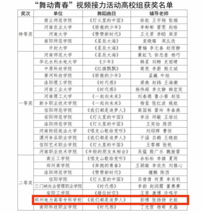 經(jīng)作品展播、專家評(píng)審等環(huán)節(jié),日前,省委教育工委、省教育廳正式公布“舞動(dòng)青春”視頻接力活動(dòng)獲獎(jiǎng)結(jié)果;顒(dòng)共評(píng)選出高校組特等獎(jiǎng)5個(gè)、一等獎(jiǎng)15個(gè)、二等獎(jiǎng)20個(gè)、三等獎(jiǎng)22個(gè)、優(yōu)秀獎(jiǎng)27個(gè),中小學(xué)(幼兒園)組特等獎(jiǎng)5個(gè)、一等獎(jiǎng)10個(gè),二等獎(jiǎng)15個(gè)、三等獎(jiǎng)20個(gè)、優(yōu)秀獎(jiǎng)28個(gè),優(yōu)秀組織獎(jiǎng)10個(gè)。鄭州電力高等?茖W(xué)校選送作品《我們都是追夢(mèng)人》榮獲二等獎(jiǎng)。
