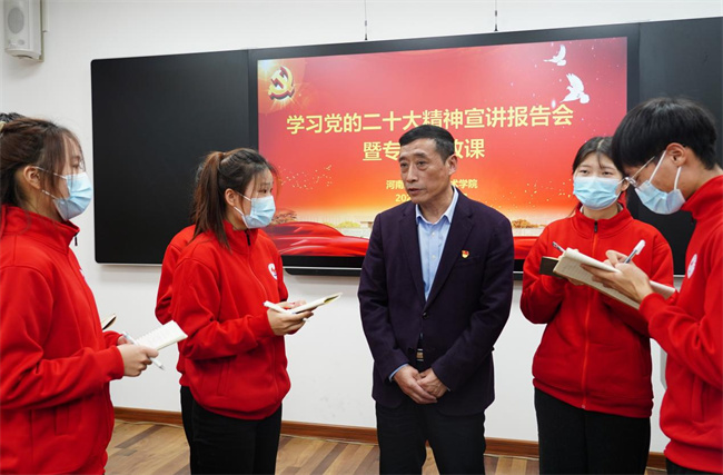 專(zhuān)題宣講“活起來(lái)”。學(xué)校黨委書(shū)記溫道軍、校長(zhǎng)王偉帶頭宣講黨的二十大精神,從黨的二十大的重大歷史意義、新時(shí)代十年的偉大變革、黨的二十大報(bào)告的創(chuàng)新理論、新時(shí)代職業(yè)教育發(fā)展目標(biāo)、如何做新時(shí)代的大先生和拔尖創(chuàng)新人才等方面,為廣大師生上專(zhuān)題思政課。深入淺出、內(nèi)涵豐富的闡述,精準(zhǔn)全面、暖心提氣的話語(yǔ),引導(dǎo)師生深刻領(lǐng)悟黨的二十大報(bào)告的理論含量、精神能量和實(shí)踐力量,進(jìn)而思考如何把黨的創(chuàng)新理論貫徹落實(shí)到推進(jìn)學(xué)校“十四五”規(guī)劃、統(tǒng)籌疫情防控和事業(yè)高質(zhì)量發(fā)展的各個(gè)方面,轉(zhuǎn)化為干事創(chuàng)業(yè)的實(shí)際成效,轉(zhuǎn)化為新征程上團(tuán)結(jié)奮斗、勇毅前行的實(shí)踐力量。學(xué)校領(lǐng)導(dǎo)、中層干部進(jìn)班級(jí)、進(jìn)課堂、進(jìn)科室,深入解讀二十大的重大意義和戰(zhàn)略部署,用事實(shí)說(shuō)話、用典型說(shuō)話、用數(shù)字說(shuō)話,把道理說(shuō)清楚,把報(bào)告講透徹,凝聚謀發(fā)展、共出彩、創(chuàng)未來(lái)的思想共識(shí)。