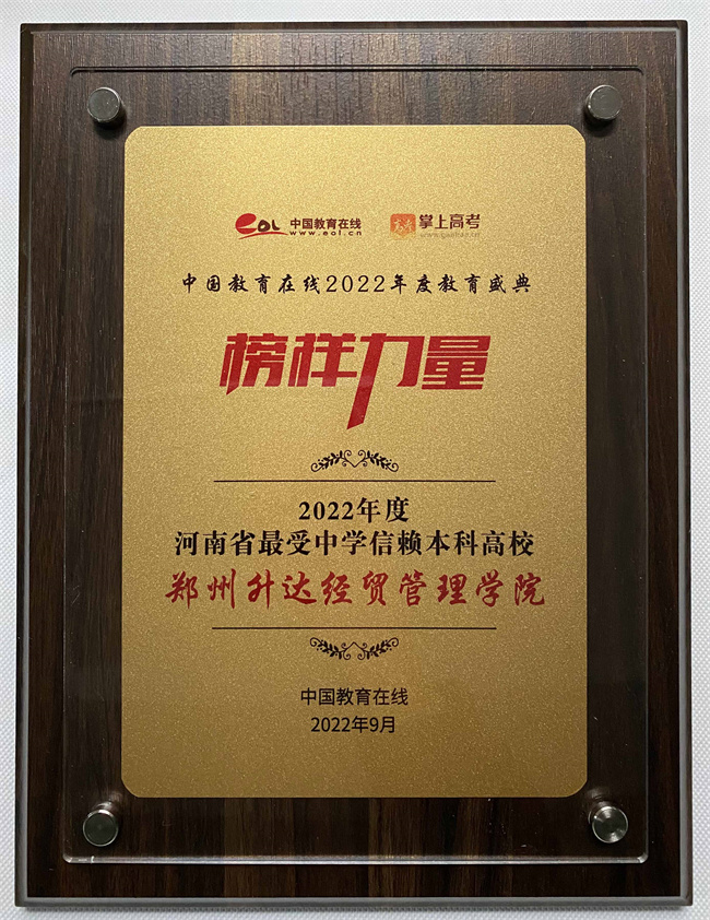 活動(dòng)經(jīng)過前期征集、專家會(huì)審、綜合評(píng)審等階段,鄭州升達(dá)經(jīng)貿(mào)管理學(xué)院從全國眾多高校中脫穎而出,獲得 “2022年度河南省最受中學(xué)信賴本科高校”獎(jiǎng)項(xiàng)。這充分體現(xiàn)了學(xué)校辦學(xué)成果得到了社會(huì)的廣泛認(rèn)可和高度好評(píng)。