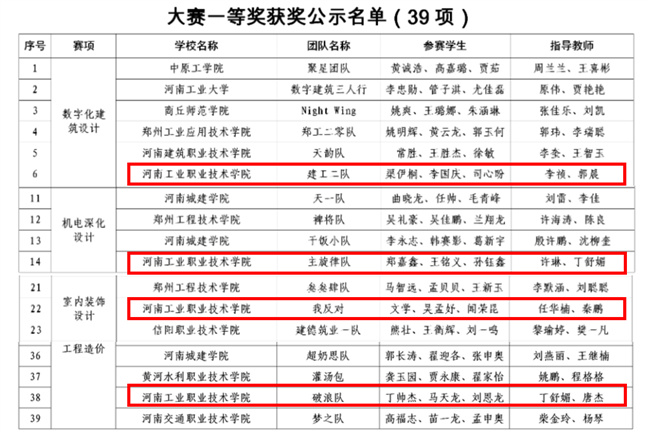 該校建筑工程學(xué)院參賽隊(duì)與眾多本科院校同臺(tái)競(jìng)技,斬獲佳績,獲得數(shù)字化建筑設(shè)計(jì)一等獎(jiǎng)1項(xiàng)、二等獎(jiǎng)1項(xiàng),機(jī)電深化設(shè)計(jì)一等獎(jiǎng)1項(xiàng),室內(nèi)裝飾設(shè)計(jì)一等獎(jiǎng)1項(xiàng)、二等獎(jiǎng)1項(xiàng),工程造價(jià)一等獎(jiǎng)1項(xiàng)、二等獎(jiǎng)1項(xiàng),工程管理二等獎(jiǎng)2項(xiàng),數(shù)字化結(jié)構(gòu)設(shè)計(jì)三等獎(jiǎng)1項(xiàng)。同時(shí),該校還獲得優(yōu)秀組織獎(jiǎng)。