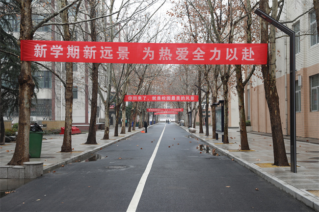 返校期間,為迎接久別重逢的學生們,該院領導班子成員提前到崗蒞臨現(xiàn)場指導工作,全體工作人員各司其職、相互協(xié)作,積極營造安全穩(wěn)定、干凈整潔、溫馨舒適的校園環(huán)境氛圍。闊別已久的校園早已裝扮一新。道路兩旁懸掛著“新學期拍了拍你,‘歡迎回家’!”“回到宿舍,終于有陪你早睡早起了”等溫情滿滿的標語……飽含著學校和老師們滿滿的愛意以及對學生們新學期的祝福。