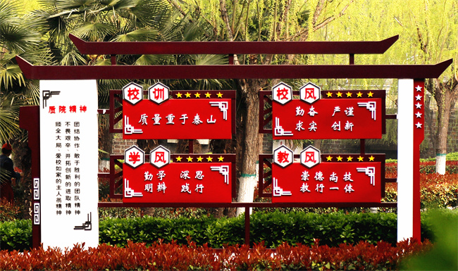 狠抓基礎(chǔ)建設(shè),增強(qiáng)環(huán)境育人功能。學(xué)院不斷完善圖書(shū)館、校史館、體育場(chǎng)、黨建活動(dòng)中心建設(shè);投入1000余萬(wàn)元進(jìn)行了校園綠化、道路升級(jí)、墻面翻新、照明亮化等。先后完成文化廣場(chǎng)升級(jí)改造和質(zhì)量廣場(chǎng)建設(shè);完成校園道路、樓宇命名、校園文化(標(biāo)識(shí)標(biāo)牌)系統(tǒng)建設(shè)。在標(biāo)識(shí)標(biāo)牌系統(tǒng)建設(shè)中,以弘揚(yáng)“質(zhì)量重于泰山”的校訓(xùn)精神和“準(zhǔn)質(zhì)量度、善物世人”的辦學(xué)宗旨為核心,引入中華傳統(tǒng)質(zhì)量文化、大學(xué)精神為學(xué)院的道路、樓宇等科學(xué)命名,如:嘉量樓、明德樓、質(zhì)善路、準(zhǔn)衡路等,并制作精美標(biāo)牌,使師生處處感受到文化的熏陶和啟迪,大大豐富了校園文化的底色,提升了校園的文化層次。