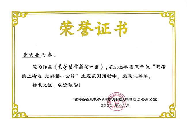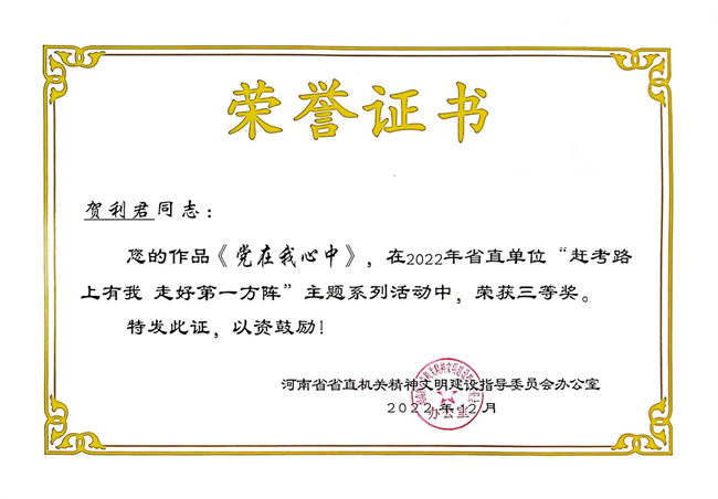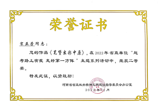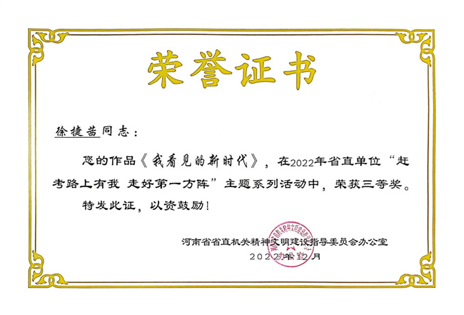 中新河南網(wǎng)3月1日電(鄭宇) 近日,省直文明辦印發(fā)《關(guān)于省直單位“趕考路上有我 走好第一方陣”主題系列活動的表揚(yáng)通報》,鄭州電力高等?茖W(xué)校報送的作品《錄芳堅館題跋一則》(曹秀會)獲書法類二等獎;《筆贊出彩中原》(宋亞芳)獲征文類二等獎;《我看見的新時代》(徐捷茜)、《黨在我心中》(賀利君)獲繪畫類三等獎。