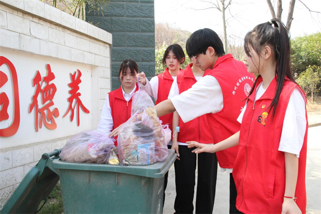 學(xué)生將沿新密溱洧流域途中撿拾的垃圾放入垃圾箱