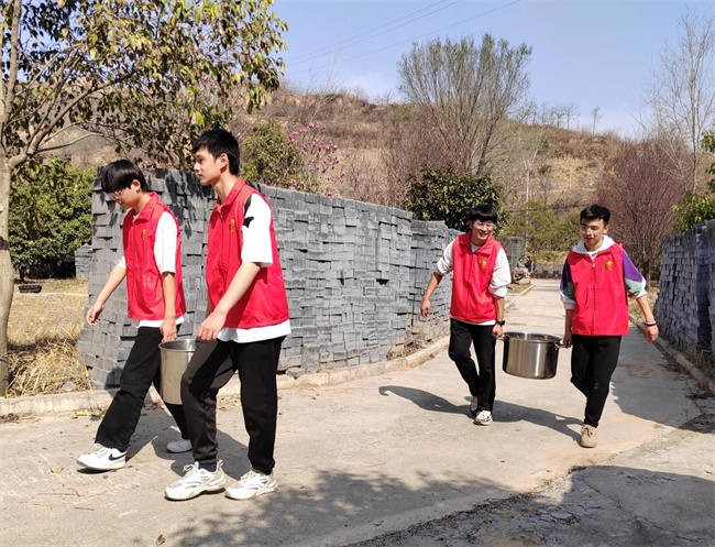 一路上,新密市莪溝村駐村老師李兆芃向大家詳細(xì)介紹村里的基本情況,同學(xué)們激情滿滿、熱情高漲。在前往植樹地點(diǎn)的路途中,老師和同學(xué)們裝滿了一袋又一袋垃圾,最后在李兆芃老師的指引下,同學(xué)們將垃圾統(tǒng)一放在集中點(diǎn)的垃圾桶里。行動不僅維護(hù)了鄉(xiāng)村環(huán)境,也讓同學(xué)們通過簡單的熱身活動體會到了在烈陽下勞動的艱辛和不易,將勞動創(chuàng)造美的道理內(nèi)化于心、外化于行。