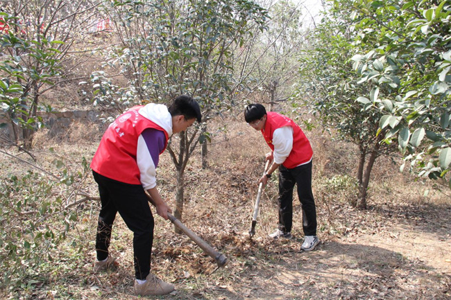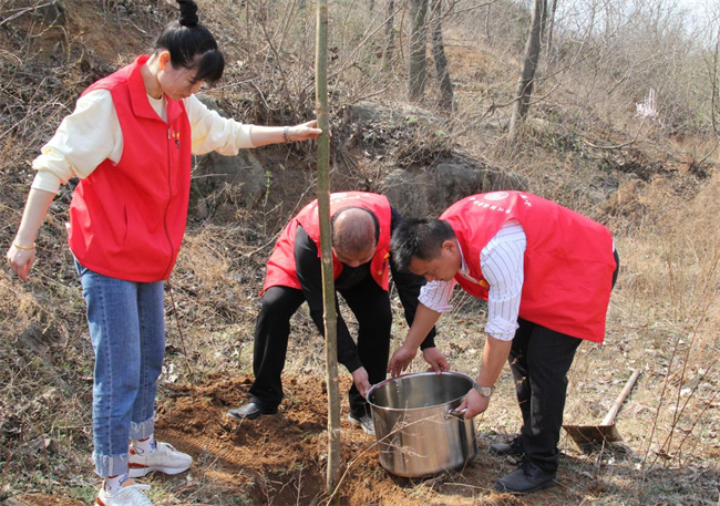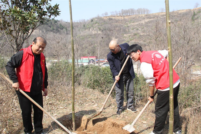 到達(dá)植樹地點(diǎn)后,新密市莪溝村駐村書記劉子印、商貿(mào)系黨支部副書記劉晉帶領(lǐng)老師、志愿者拿著鏟子上山挖坑,開始了植樹準(zhǔn)備工作。與此同時,村民們現(xiàn)場教其他志愿者怎樣植樹,每個志愿者都認(rèn)真聽講并積極實(shí)踐;顒蝇F(xiàn)場,大家都干勁十足,積極認(rèn)領(lǐng)“責(zé)任樹”,兩人一組,迅速投入到植樹活動中,揮鍬挖坑、扶樹填土、提水澆樹,相互協(xié)作、配合默契,每一道工序都做得一絲不茍,現(xiàn)場充滿了團(tuán)結(jié)協(xié)作、奮發(fā)向上的融洽氛圍,真正展現(xiàn)了青年學(xué)子奮發(fā)向上的精神風(fēng)貌。經(jīng)過2個多小時的揮汗奮戰(zhàn),一棵棵樹苗迎風(fēng)挺立,為早春增添新綠,鄭州財稅金融職業(yè)學(xué)院“小蜜蜂”志愿者喬冠宇說:“通過本次志愿植樹活動,豐富了我們的課外實(shí)踐活動的同時,也讓我們感受到了志愿服務(wù)的快樂,希望更多的同學(xué)們能參與生態(tài)環(huán)境志愿服務(wù)活動,以己之力踐行志愿精神、保護(hù)生態(tài)環(huán)境!”