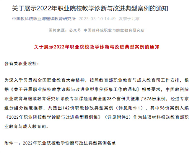學(xué)校診改典型案例入選2022年職業(yè)院校教學(xué)診斷與改進(jìn)典型案例名單