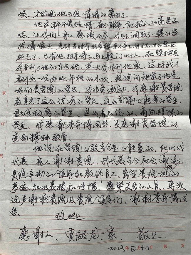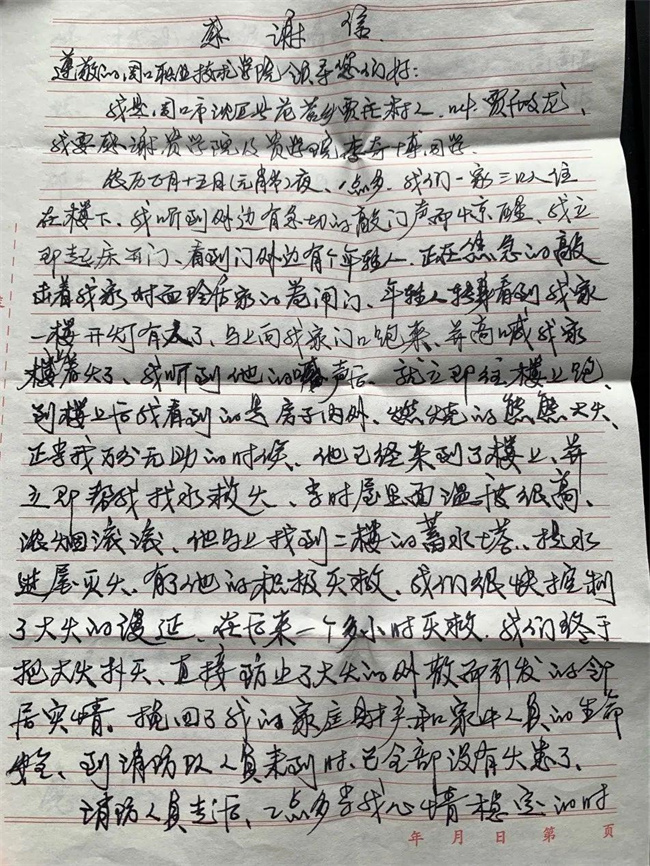 火越燒越旺,李奇博同學(xué)讓自己冷靜下來,首先將易燃易爆物品轉(zhuǎn)移,尋找身邊可以用的滅火工具,看到了二樓的蓄水罐,引水!李奇博同學(xué)急中生智,用二樓的蓄水罐,提水滅火,一趟又一趟地提水滅火。濃煙彌漫了所有人的眼和臉,大家還在奮力滅火,但火勢還是未能得到控制,慢慢的,呼吸的急促聲,咳嗽聲和劈劈啪啪的炙烤聲混成了一片,很是作響。但是李奇博和著火的那一家居民依舊沒有放棄,不停的撲火,提水,經(jīng)過長時間的奮戰(zhàn),幫賈殿龍一家撲滅了大火,之后就默默離開了。事后,賈殿龍一家通過各種途徑找到了李奇博同學(xué)表達謝意但是被他婉拒了,后來賈殿龍一家在鄰居口中得知李奇博同學(xué)是周口職業(yè)技術(shù)學(xué)院學(xué)生,并以寫感謝信的形式再次向?qū)W校、向李奇博同學(xué)表達感謝!
