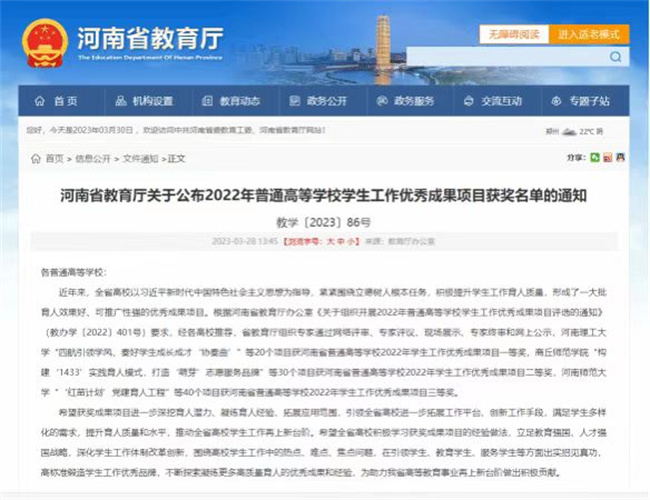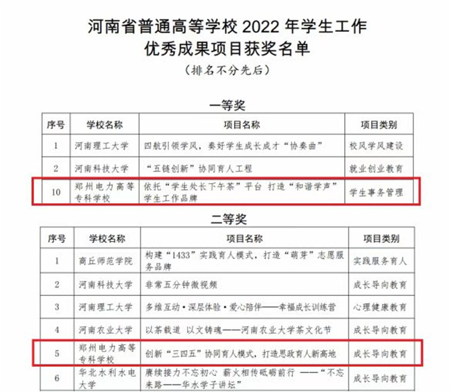 據(jù)悉,本次評選經(jīng)高校推薦、省教育廳組織專家評審,通過網(wǎng)絡(luò)評審、專家評議、現(xiàn)場展示、專家終審等環(huán)節(jié),評選出2022年普通高等學(xué)校學(xué)生工作優(yōu)秀成果項目一等獎20項、二等獎30項、三等獎40項。鄭州電力高等專科學(xué)校始終堅持立德樹人根本任務(wù),堅持為黨育人、為國育才,立足學(xué)生工作中的重點、難點、焦點問題,全力打造學(xué)生工作品牌。黨委學(xué)生工作部將以此次成績?yōu)槠鯔C,積極探索新時代大學(xué)生思想政治工作的新模式、新方法,全力服務(wù)學(xué)生成長成才,為學(xué)校高質(zhì)量發(fā)展做出新的更大貢獻(xiàn)! 3月28日,河南省教育廳下發(fā)《河南省教育廳關(guān)于公布2022年普通高等學(xué)校學(xué)生工作優(yōu)秀成果項目獲獎名單的通知》(教學(xué)〔2023〕86號),鄭州電力高等?茖W(xué)校報送的《依托“學(xué)生處長下午茶”平臺 打造“和諧學(xué)聲”學(xué)生工作品牌》和《創(chuàng)新“三四五”協(xié)同育人模式,打造思政育人新高地》兩項學(xué)生工作優(yōu)秀成果分別榮獲一等獎和二等獎,取得了學(xué)校在該項評選中的最佳成績。