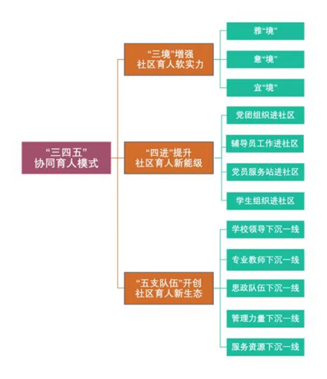 鄭州電力高等?茖W(xué)校“三四五”協(xié)同育人模式,以“三境”增強社區(qū)育人軟實力,以“四進(jìn)”提升社區(qū)育人新能級,以“五支隊伍”開創(chuàng)社區(qū)育人新生態(tài)。通過學(xué)生社區(qū)引領(lǐng)思政育人新高地,激發(fā)全員育人主體活力,把思想政治工作貫穿育人全過程,全方位覆蓋育人空間場域。著力形成各種育人元素作用充分發(fā)揮、全員全程全方位育人文化全面養(yǎng)成的一體化學(xué)生社區(qū)育人體系。