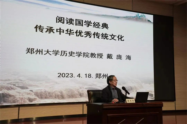 教師代表、全國職業(yè)院校教師技能大賽全國一等獎獲得者馬雁和學(xué)生禹翔耀向全校師生發(fā)出閱讀倡議。學(xué)校信通學(xué)院展示了情景誦讀《覺醒年代——請黨放心強(qiáng)國有我》,師生們激情澎湃的朗誦,贏得了現(xiàn)場觀眾們的陣陣掌聲。最后,鄭州大學(xué)歷史學(xué)院國學(xué)系主任戴龐海教授作《閱讀國學(xué)經(jīng)典傳承中華優(yōu)秀傳統(tǒng)文化》主題講座。
