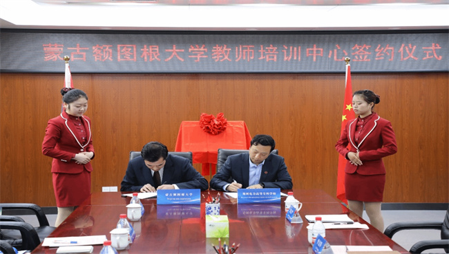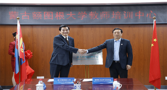 會(huì)上,楊小琨副校長(zhǎng)進(jìn)行了熱情洋溢的致辭,從悠久深厚的歷史底蘊(yùn)、特色鮮明的行業(yè)辦學(xué)、設(shè)施完善的教學(xué)硬件、質(zhì)效雙高的職業(yè)培訓(xùn)和創(chuàng)新模式的國(guó)際交流5個(gè)方面簡(jiǎn)潔、全面地對(duì)鄭州電力高等專(zhuān)科學(xué)校進(jìn)行了介紹,并表示在未來(lái)的合作中聚焦高質(zhì)量發(fā)展,持續(xù)深化人文交流與教育合作。蒙古額圖根大學(xué)副校長(zhǎng)艾德賽汗(Nyamzagd IDERSAIHAN)表示蒙古額圖根大學(xué)于2001年建校后快速發(fā)展,作為蒙古重點(diǎn)大學(xué),曾獲得“蒙古最好環(huán)境學(xué)校”稱(chēng)號(hào);擁有醫(yī)學(xué)、護(hù)理學(xué)、商學(xué)、會(huì)計(jì)學(xué)等24個(gè)本科專(zhuān)業(yè),同時(shí)建立的還有碩士和博士培養(yǎng)點(diǎn);大學(xué)始終秉承為社會(huì)培養(yǎng)有能力、有思想、有責(zé)任感的復(fù)合型人才的宗旨,深耕于高質(zhì)量高等教育教育二十余載,希望此次簽約可以與中國(guó)在學(xué)術(shù)、技術(shù)和人文方面有更深、更長(zhǎng)遠(yuǎn)的合作。隨后雙方簽訂合作備忘錄并共同為“蒙古教師培訓(xùn)中心”揭牌。