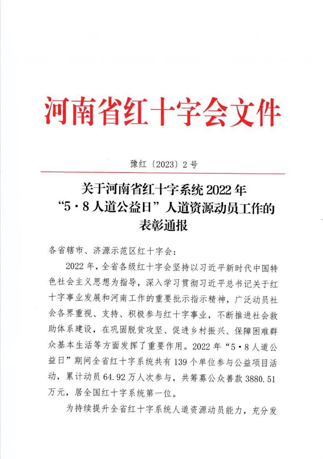 中新河南網(wǎng)4月28日電(侯靜) 近日,河南省紅十字會(huì)發(fā)布《關(guān)于河南省紅十字系統(tǒng)2022年58人道公益日人道資源動(dòng)員工作的表彰通報(bào)》,對(duì)工作成績(jī)突出的單位進(jìn)行表彰,黃河水利職業(yè)技術(shù)學(xué)院獲評(píng)“人道資源動(dòng)員工作愛心單位”。