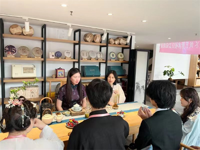 大家品飲著林艷親自采摘炒制的金剛臺雨前毛尖,一邊吟誦:一碗喉吻潤。二碗破孤悶。三碗搜枯腸,惟有文字五千卷。四碗發(fā)輕汗,平生不平事,盡向毛孔散。五碗肌骨清。六碗通仙靈。七碗吃不得也,唯覺兩腋習(xí)習(xí)清風(fēng)生。在悠揚的音樂聲中沉浸式體驗茶仙盧仝的煎茶道。
