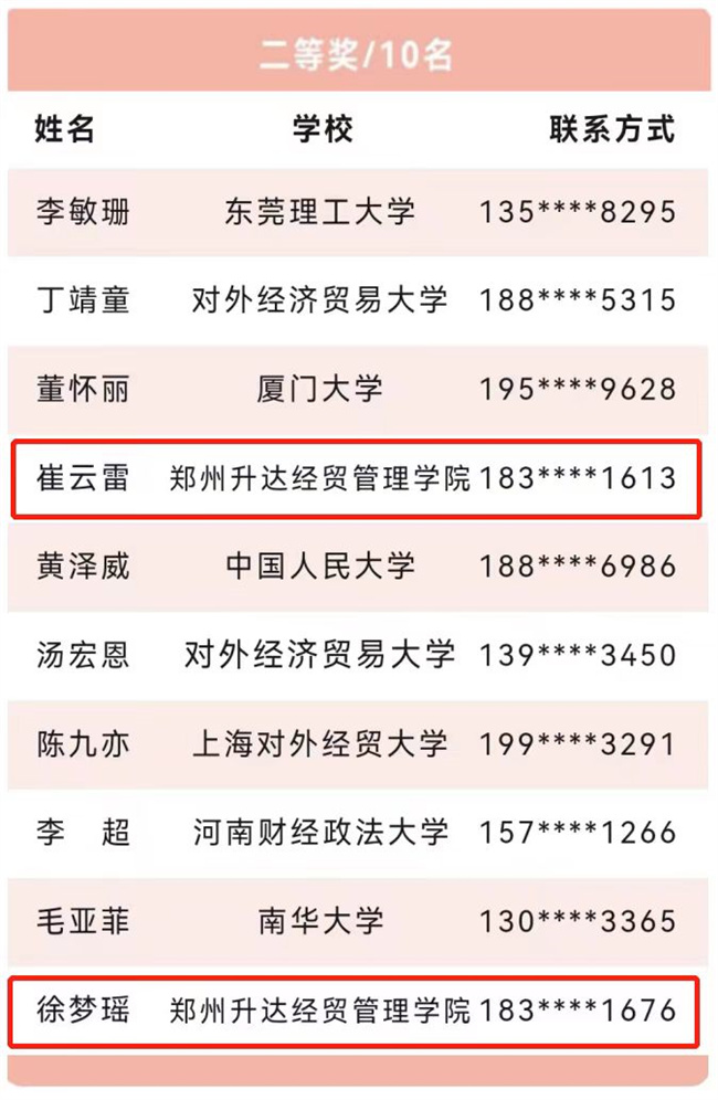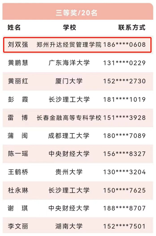 鄭州升達(dá)經(jīng)貿(mào)管理學(xué)院金融工程、金融學(xué)專業(yè)學(xué)生在徐云燕、蔡艷兩位指導(dǎo)老師的帶領(lǐng)下,與來自中國人民大學(xué)、廈門大學(xué)、中央財經(jīng)大學(xué)等120余所高校,1500余名學(xué)生同場競技。最終,來自20金工2班的崔云雷、20金工1班的徐夢瑤榮獲二等獎,20金工2班的劉雙強(qiáng)獲三等獎。