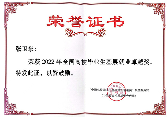 “全國高校畢業(yè)生基層就業(yè)卓越獎”由教育部高校學(xué)生司、教育部學(xué)生服務(wù)與素質(zhì)發(fā)展中心共同指導(dǎo),中國長江三峽集團(tuán)出資,中國教育發(fā)展基金會設(shè)立;旨在獎勵普通高校赴基層就業(yè)并做出突出業(yè)績的畢業(yè)生和指導(dǎo)服務(wù)大學(xué)生赴基層就業(yè)工作有突出貢獻(xiàn)的教師。2023年1月,教育部部署各地各高校開展“全國高校畢業(yè)生基層就業(yè)卓越獎”推薦活動,經(jīng)各省(市、自治區(qū))評選推薦,從全國2700余所普通高校中確定獎勵畢業(yè)生398人、教師60人。