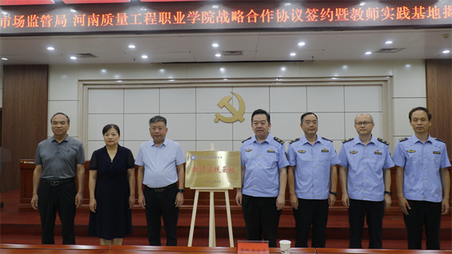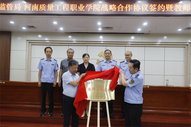 在儀式現(xiàn)場,邱紅標(biāo)和孫國權(quán)共同為“河南質(zhì)量工程職業(yè)學(xué)院教師實(shí)踐基地”揭牌。葛長龍、劉宏偉分別代表雙方簽訂戰(zhàn)略合作協(xié)議。