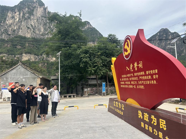隨后,實(shí)踐團(tuán)深入河南省“鄉(xiāng)村旅游特色村”、輝縣市“文明村”圪針莊,對村莊的黨建工作、特色產(chǎn)業(yè)等進(jìn)行了深入調(diào)研,并對村支書梁三平進(jìn)行了專訪。梁書記向團(tuán)隊(duì)成員介紹到:通過聚焦黨建引領(lǐng)、產(chǎn)業(yè)發(fā)展等工作,村里建立鄉(xiāng)村振興亭、豐富鄉(xiāng)村文化建設(shè),依托寶泉風(fēng)景區(qū),以養(yǎng)殖業(yè)、種植業(yè)、旅游業(yè)為契機(jī),拓展休閑農(nóng)業(yè)功能,建設(shè)特色民宿,打造品牌化旅游示范區(qū),讓群眾過上更舒心的日子,帶領(lǐng)村民集體致富,目前村民基本在家務(wù)工、許多優(yōu)秀青年返鄉(xiāng)創(chuàng)業(yè)。