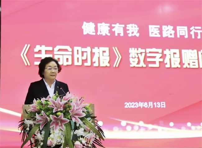 學(xué)校老科協(xié)會(huì)長(zhǎng)徐玉芳教授在《生命時(shí)報(bào)》數(shù)字報(bào)贈(zèng)閱儀式上發(fā)言