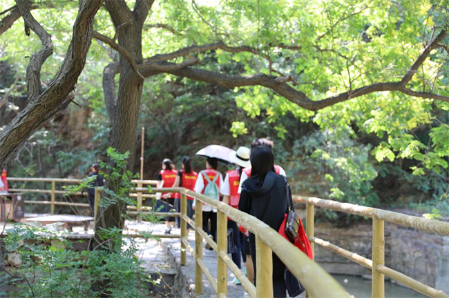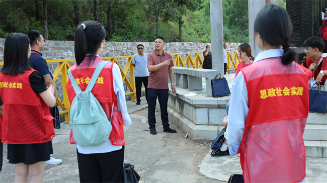 18日上午,師生們沿著紅旗渠干渠甬道走“紅飄帶”,觀摩了紅旗渠創(chuàng)業(yè)洞、團結洞、兩半山、鷹嘴山、青年洞等偉大工程。在走的過程中,師生們了解到青年洞修建時創(chuàng)造了連環(huán)炮、瓦缸窯炮、三角炮等多項新的爆破技術,由此學習到林縣人民在極其艱難的條件下修筑紅旗渠時所展現的艱苦奮斗、能干會干的精神。師生們紛紛感嘆,在六幾年那個敏感而特殊的年代,全國幾乎所有工程都叫停的情況下,楊貴書記冒著巨大的政治風險、頂住壓力,偷偷安排300名青年人施工,爭分奪秒修建了水渠關鍵點“青年洞”,讓林縣人民的希望成真,楊貴書記的行為讓師生們真正的理解了 “替擔當的干部擔著,替負責的干部負責”的深刻內涵。最后,在青年洞旁黨旗下,邱啟光老師帶領師生們學習了青年洞的簡介,師生們面對鮮艷的黨旗,重溫入黨誓詞,鏗鏘有力的聲音彰顯出屬于新時代青年的自豪感和使命感。