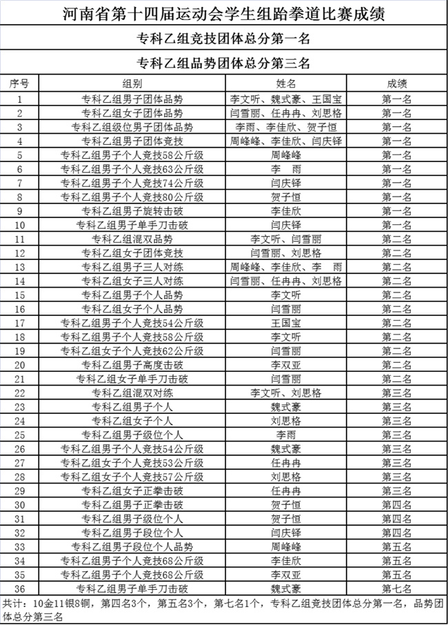 焦作大學共派出12名跆拳道運動員參加了本次比賽,共斬獲29枚獎牌,其中金牌10枚、銀牌11枚、銅牌8枚,同時獲得?埔医M競技團體總分第一名、?埔医M品勢團體總分第三名。