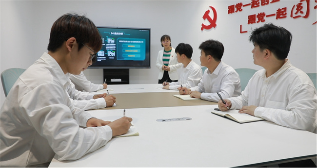 在與指導(dǎo)教師及團(tuán)隊(duì)成員分析行業(yè)痛點(diǎn) 桂浩(左一)