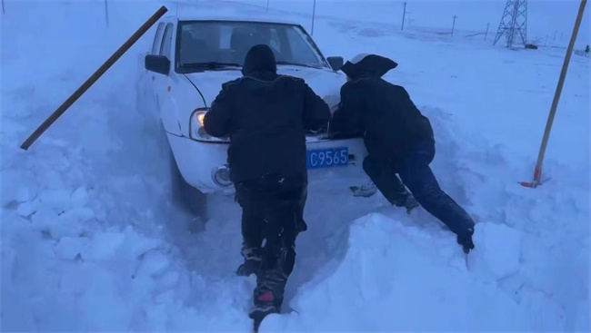 “糟糕,咱們的車陷進雪里了!”薛騰騰對身旁的同事說。此時,任憑他怎么加大馬力,車始終趴住不動。這里的積雪深度已達半米,兩人剛一下車,小腿就直愣愣地扎進雪里,被雪緊緊包裹起來。必須完成今天的工作任務(wù)!抱著這樣的信念,兩人跪在冰雪里,拿起鐵鍬在輪胎周圍使勁挖雪,挖不到的地方就用手刨,輪胎打滑就把毯子墊在車輪底下輔助。就這樣,兩人硬是開出了一條“新路”。