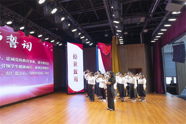 優(yōu)秀輔導(dǎo)員代表吳冰倩、優(yōu)秀教師代表于彭濤在大會上作了發(fā)言,新入職教職工進行了入職宣誓。金融學(xué)院王柏涵同學(xué)作為學(xué)生代表向廣大教職員工獻詞。