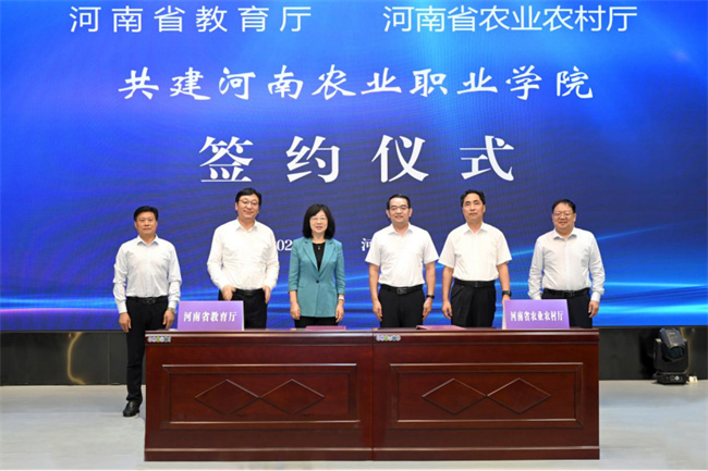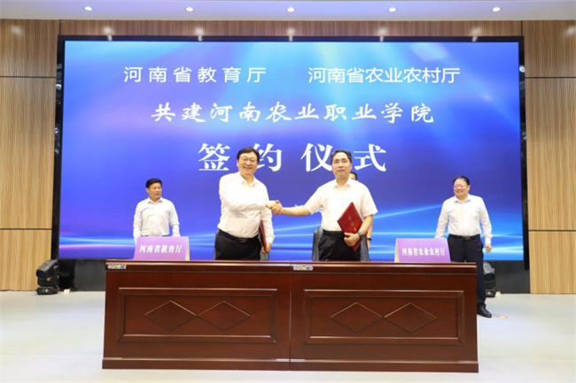 省委教育工委副書記、省教育廳黨組書記、廳長(zhǎng)毛杰;省委農(nóng)辦主任、省農(nóng)業(yè)農(nóng)村廳黨組書記、廳長(zhǎng)孫巍峰;省教育廳黨組成員、副廳長(zhǎng)朱自鋒;省委農(nóng)辦副主任、省農(nóng)業(yè)農(nóng)村廳黨組成員、副廳長(zhǎng)馬萬里;河南農(nóng)業(yè)職業(yè)學(xué)院黨委書記劉源,院長(zhǎng)劉榮寧出席簽約儀式。