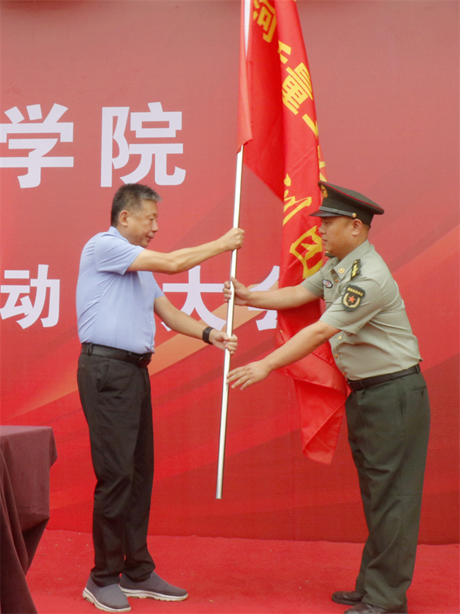 隨后,邱紅標向2023級新生軍訓團團長趙振剛授軍訓團團旗。施訓教官進行了列隊展演。
