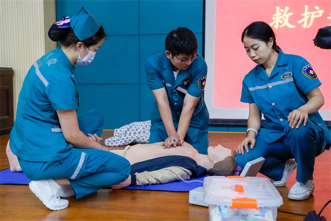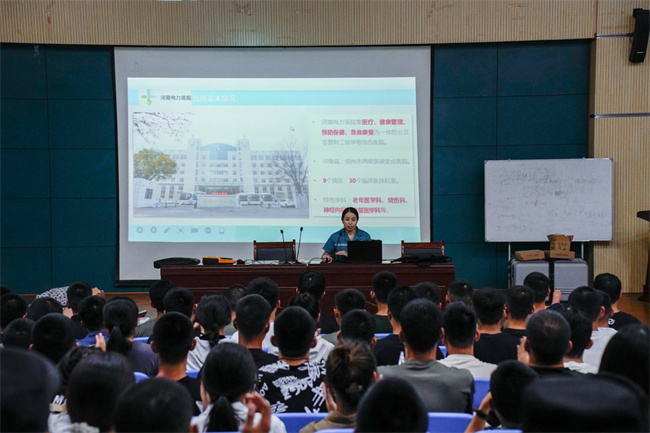中新河南網(wǎng)9月14日電(范艷武) 為普及急救知識,增強學(xué)生軍訓(xùn)教官的安全防范意識,提高應(yīng)對突發(fā)事件和意外傷害的救助能力,更好地保障學(xué)生軍訓(xùn)教官以及參訓(xùn)學(xué)生的生命安全和身體健康,9月11日下午,鄭州電力高等?茖W(xué)校武裝部聯(lián)合后勤服務(wù)中心邀請河南電力醫(yī)院急救中心醫(yī)生來校,在教學(xué)樓二區(qū)101室為全體2023級新生軍訓(xùn)教官開展了醫(yī)療救護知識培訓(xùn)。