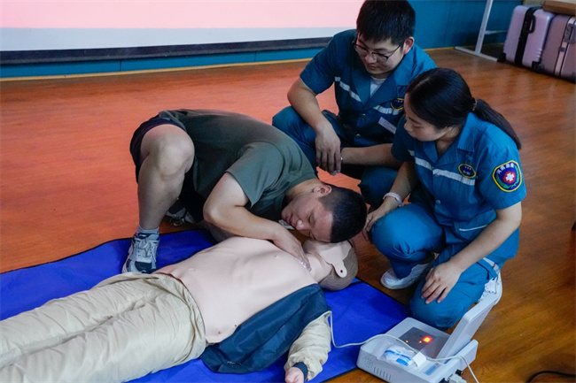 在互動環(huán)節(jié)中,教官們都積極參與體驗心肺復(fù)蘇的按壓手法、按壓頻率、按壓深度等實踐操作。每個動作、每個步驟,教官們都認真觀察、力度到位、熟練掌握并積極回答課上提問,極大地提高了實踐能力。