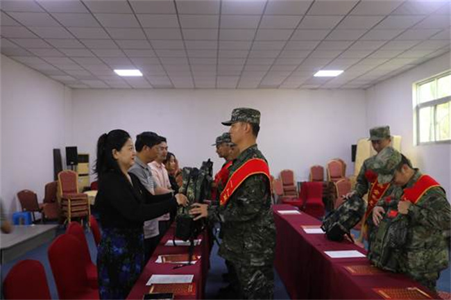 輔導(dǎo)員為新兵發(fā)放慰問品