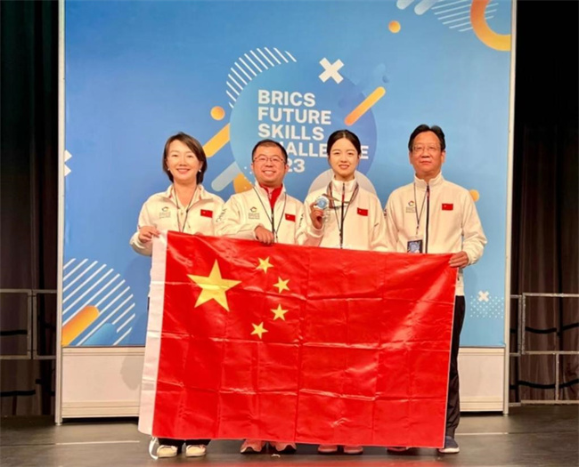 賽場(chǎng)上,王曉丹老師克服比賽強(qiáng)度大、時(shí)間要求緊等困難和挑戰(zhàn),與來(lái)自金磚五國(guó)的參賽隊(duì)伍同臺(tái)競(jìng)技,經(jīng)過(guò)三天激烈地角逐,以精彩的作品和扎實(shí)的技能在國(guó)際賽場(chǎng)上展示了中國(guó)風(fēng)采,獲得銀牌,代表學(xué)校站上世界級(jí)技能比賽的領(lǐng)獎(jiǎng)臺(tái)。