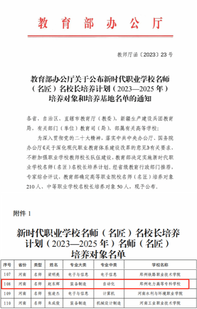 中新河南網(wǎng)10月10日電(李安杰) 近日,教育部辦公廳公布新時代職業(yè)學校名師(名匠)名校長培養(yǎng)計劃(2023—2025 年)培養(yǎng)對象和培養(yǎng)基地名單,鄭州電力高等?茖W校教師趙東輝成功入選裝備制造自動化類名師(名匠)名校長培養(yǎng)計劃(2023—2025 年)名師(名匠)培養(yǎng)對象。