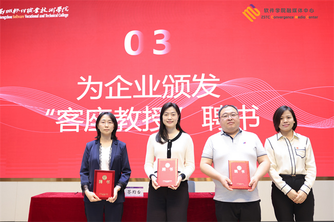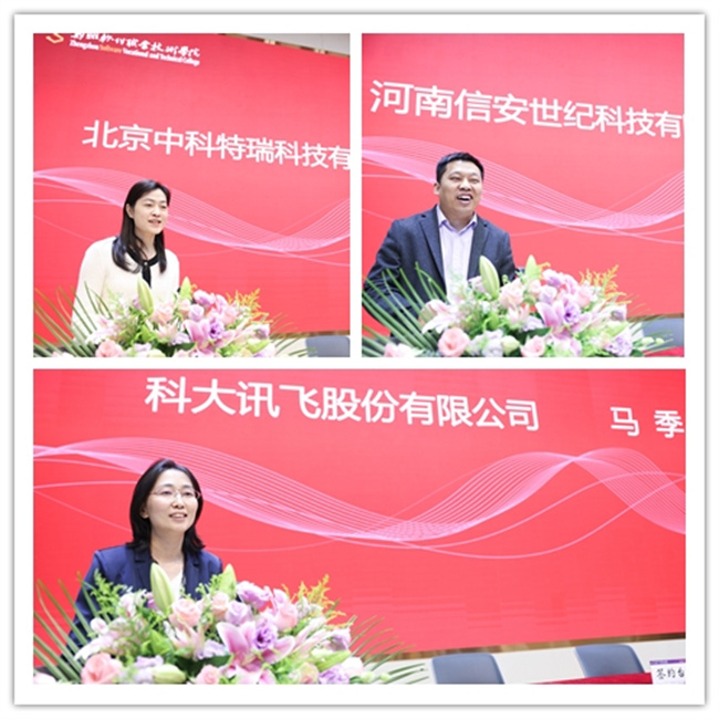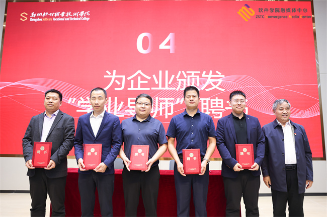 鄭州軟件職業(yè)技術(shù)學(xué)院為科大訊飛馬季、北京中科特瑞林英、河南信安世紀(jì)劉鵬飛頒發(fā)“鄭州軟件職業(yè)技術(shù)學(xué)院客座教授”聘書;為楊少明,張承云頒發(fā)“學(xué)業(yè)導(dǎo)師”聘書。