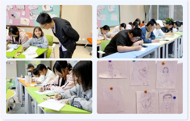 在繪畫的過(guò)程中,同學(xué)們一邊認(rèn)真描繪自己的外貌特征,一邊和老師溝通自己的想法。當(dāng)同學(xué)們作畫完畢后,老師對(duì)了每一幅作品進(jìn)行了點(diǎn)評(píng),通過(guò)色彩的選擇、線條的運(yùn)用、形狀的構(gòu)建等,分析同學(xué)們的內(nèi)心世界和感受。