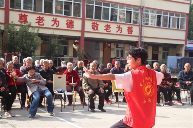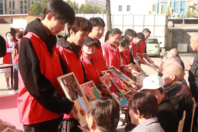 10月21日、10月23日,文化與旅游學(xué)院、藝術(shù)設(shè)計(jì)學(xué)院師生志愿者來(lái)到濟(jì)源市老來(lái)樂(lè)老年公寓。藝術(shù)設(shè)計(jì)學(xué)院師生志愿者親切地與老人交談,送上節(jié)日祝福和節(jié)日禮物——以重陽(yáng)節(jié)為主題、親手用黏土制作的手工藝品以及書(shū)法作品,并把這些作品布置到活動(dòng)室和住所內(nèi),營(yíng)造豐富的生活?yuàn)蕵?lè)氛圍。他們還為老人們講解和示范八段錦健身氣功,深受老人們喜歡。文化與旅游學(xué)院志愿者自發(fā)表演文藝節(jié)目,給老人按摩,陪老人們聊天拉家常,與老人分享自己的校園生活,并祝愿他們健康長(zhǎng)壽、幸福滿滿。同時(shí),志愿者們還開(kāi)展了衛(wèi)生清掃活動(dòng),使養(yǎng)老院的整體面貌煥然一新。