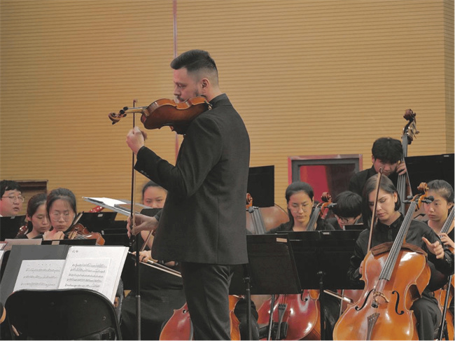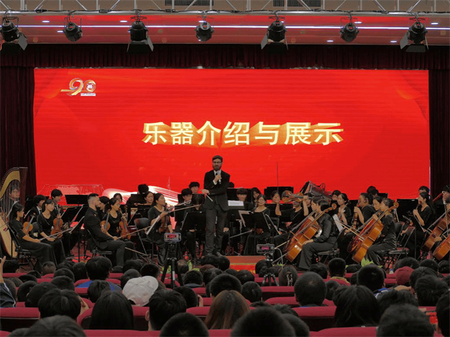 演出期間,Andrew Job Davis (安卓)指揮以“趣味講解+現(xiàn)場(chǎng)演奏”的方式,用激情而獨(dú)具魅力的指揮與有趣而簡(jiǎn)單易懂的語言,為在場(chǎng)的師生普及了交響樂分類——弦樂組、木管組、銅管組、打擊樂組等,通過講明這些樂器的音區(qū)、音色等特點(diǎn)和現(xiàn)場(chǎng)示范,讓該校師生很好地感受了這些樂器的特點(diǎn)及表現(xiàn)力。