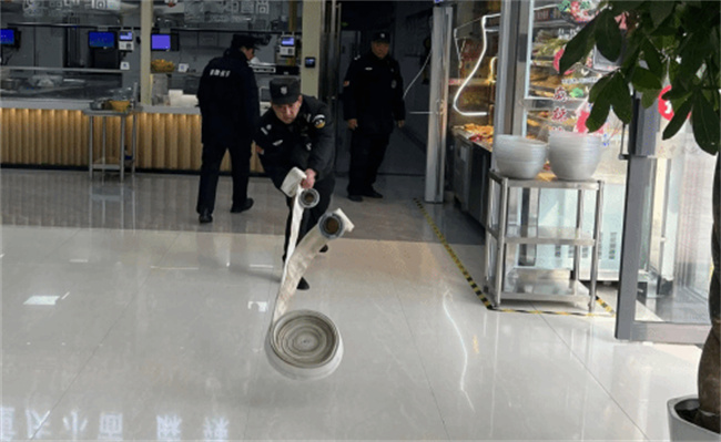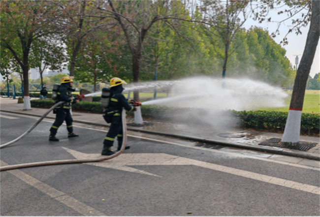 隨后,演練隊伍模擬食堂一樓東操作間發(fā)生火情,校衛(wèi)隊員迅速趕到,就近打開室內(nèi)消火栓,取出水帶,拉至起火點附近;緊接著,消防員駕駛消防車趕到,攜帶消防裝備沖進操作間,協(xié)同校衛(wèi)隊員共同處置火情。