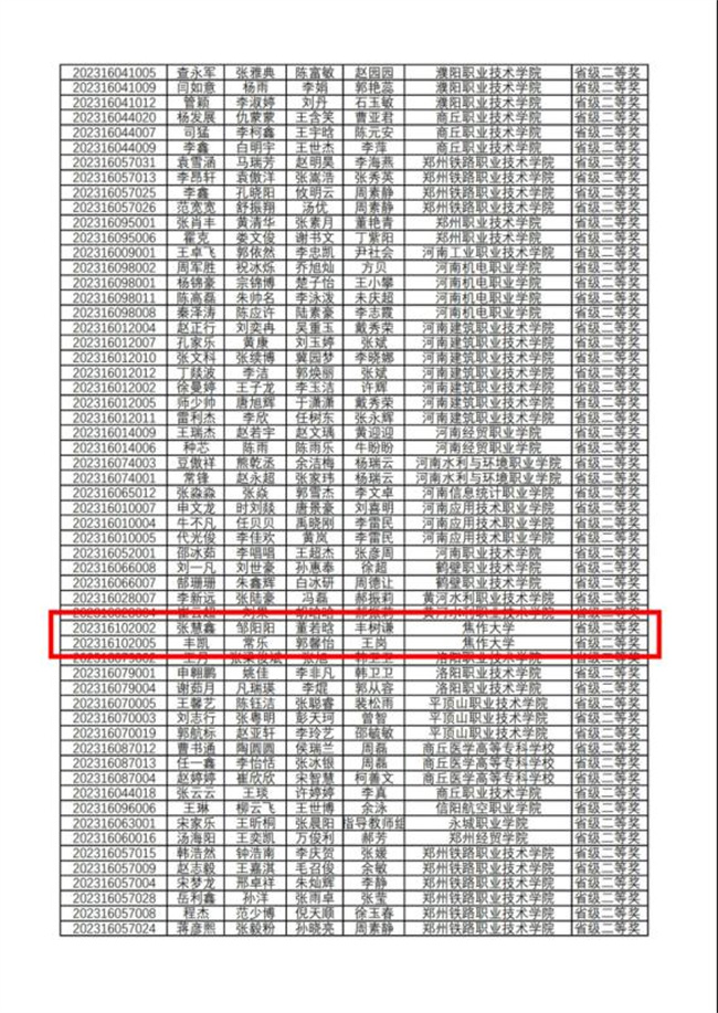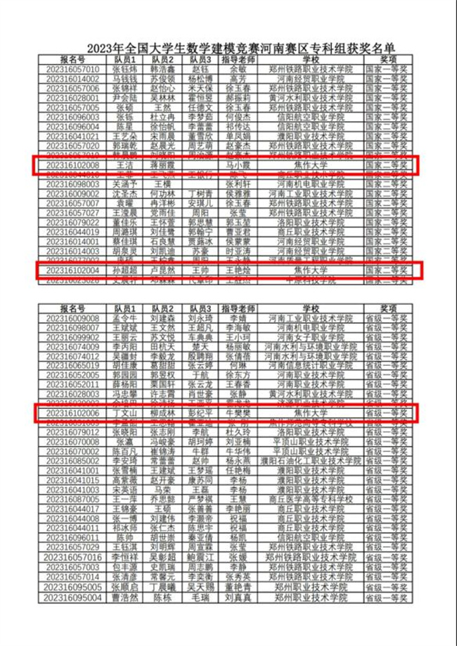 中新河南網11月27日電 2023年“高教社杯”全國大學生數(shù)學建模競賽已圓滿結束。河南賽區(qū)共有88所院校的2872個代表隊參加比賽,其中獲得全國一等獎23項、二等獎75項,?平M省級一等獎71項、二等獎86項、三等獎89項。焦作大學基礎教學部的參賽隊伍,團結一心、攻堅克難,經過一路的拼搏和努力,最終取得了國家二等獎2項,省級一等獎2項、二等獎2項、三等獎1項的優(yōu)異成績。