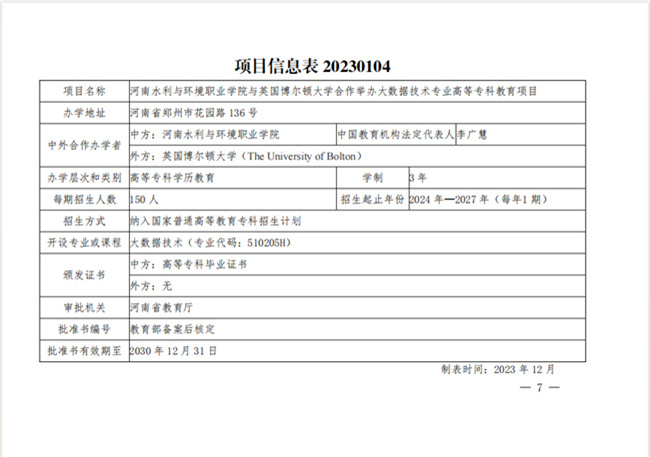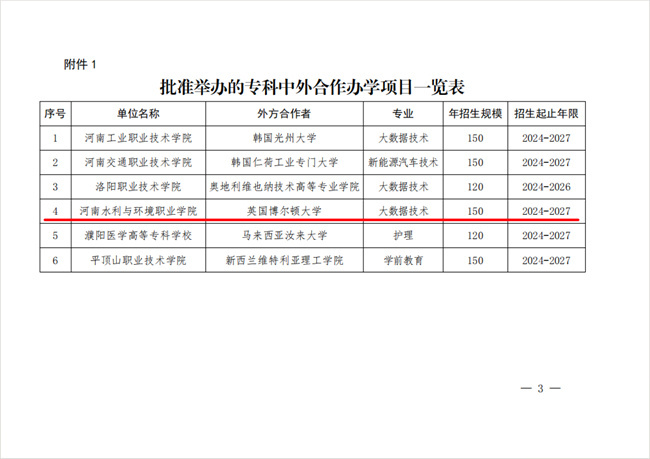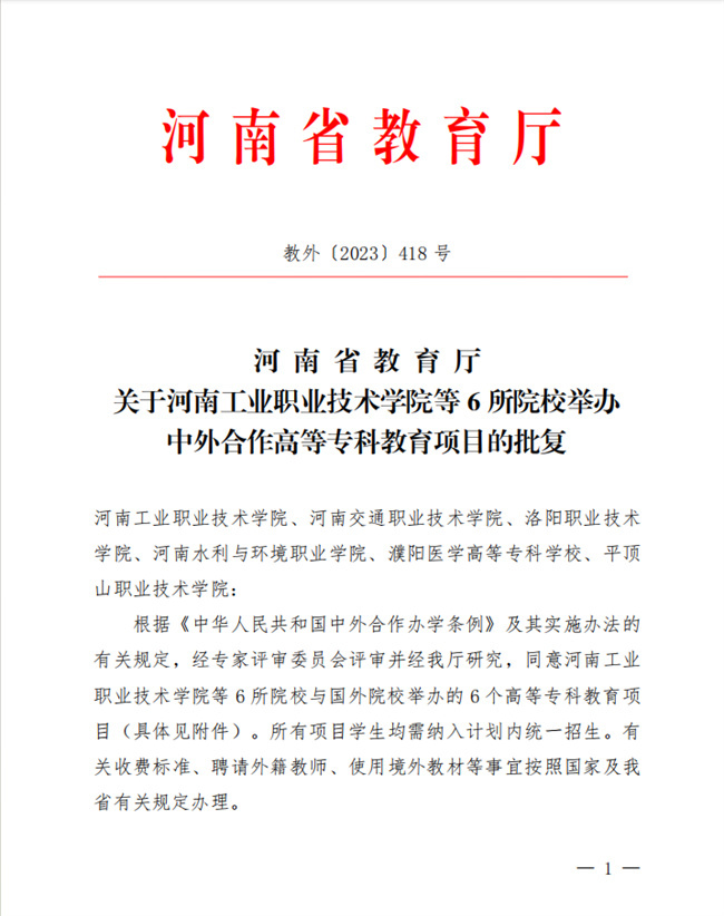 獲批后,該項(xiàng)目納入國(guó)家普通高等教育專科招生計(jì)劃,學(xué)制3年,每年計(jì)劃招生150人。這是河南水利與環(huán)境職業(yè)學(xué)院繼2019年和2021年獲批與馬來(lái)西亞世紀(jì)大學(xué)和馬來(lái)西亞瑪莎大學(xué)的合作辦學(xué)項(xiàng)目外,又一個(gè)被省教育廳批準(zhǔn)的中外合作辦學(xué)項(xiàng)目,對(duì)于持續(xù)擴(kuò)大提升學(xué)校中外合作辦學(xué)的院校數(shù)量、專業(yè)規(guī)模和內(nèi)容質(zhì)量等有著重要意義,將進(jìn)一步加快學(xué)校國(guó)際交流與合作工作步伐,有力提升學(xué)校教育國(guó)際化水平。