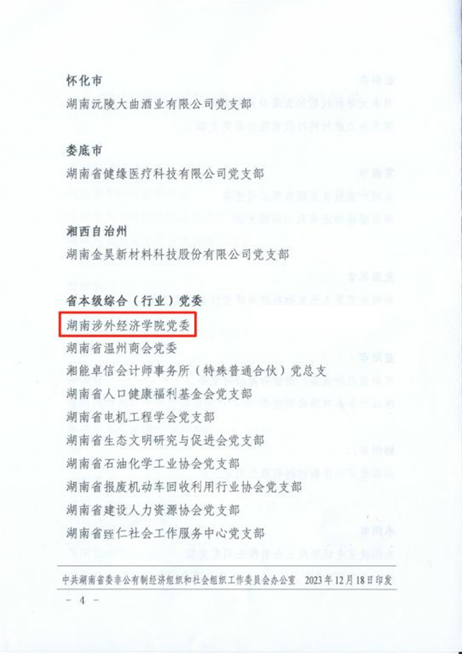 湖南涉外經(jīng)濟(jì)學(xué)院黨委被評為“2023年全省兩新領(lǐng)域標(biāo)桿黨組織”