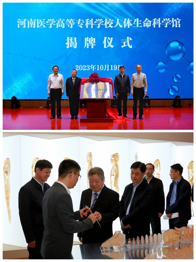 中國(guó)解剖學(xué)會(huì)理事長(zhǎng)李云慶、學(xué)校黨委書(shū)記花明、省衛(wèi)生健康委和省教育廳領(lǐng)導(dǎo)共同為人體生命科學(xué)館揭牌。人體生命科學(xué)館于2021年開(kāi)建,2023年9月竣工,先后投入1000多萬(wàn)元,建成面積約2000平方米,館內(nèi)各類(lèi)陳列標(biāo)本1000余件,由生命長(zhǎng)廊、報(bào)告廳及主場(chǎng)館三部分組成,充分運(yùn)用現(xiàn)代多媒體手段,依托陳列標(biāo)本、科普視頻、3D動(dòng)畫(huà)、VR虛擬仿真技術(shù)等,融匯“互聯(lián)網(wǎng)+”現(xiàn)代科技,集教育性、科學(xué)性、藝術(shù)性和思想性于一體,具有很強(qiáng)的實(shí)訓(xùn)教學(xué)和科普教育意義,為衛(wèi)生健康類(lèi)專業(yè)學(xué)生開(kāi)展實(shí)訓(xùn)教學(xué)和公眾認(rèn)識(shí)生命科學(xué)提供了重要平臺(tái)。