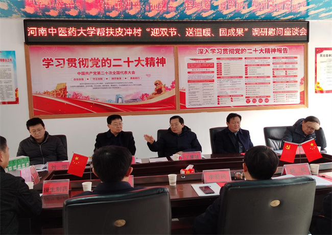 在固始縣皮沖村,王耀獻(xiàn)一行在固始縣縣長(zhǎng)李新民,縣委常委、縣委辦主任游安光,副縣長(zhǎng)楊松,武廟集鎮(zhèn)鎮(zhèn)長(zhǎng)余勛建等陪同下,參觀了“皮沖村生態(tài)文化體驗(yàn)館”,察看了學(xué)校援建的河堤安全護(hù)欄等項(xiàng)目,看望慰問(wèn)了駐村工作隊(duì)員和脫貧戶。在皮沖村村委會(huì)議室,駐村第一書記王北溟、第一團(tuán)支部書記馬運(yùn)鋒分別就“五星”支部創(chuàng)建、2023年定點(diǎn)幫扶工作情況和下一步工作打算及團(tuán)建工作進(jìn)行了匯報(bào)。皮沖村黨支部書記陳金括代表全體村民向大學(xué)領(lǐng)導(dǎo)和駐村隊(duì)員的辛勤付出表示真誠(chéng)感謝。李新民代表縣委、縣政府向河南中醫(yī)藥大學(xué)多年來(lái)對(duì)皮沖村的幫扶和駐村工作隊(duì)的無(wú)私奉獻(xiàn)表示衷心的感謝,希望結(jié)合固始縣產(chǎn)業(yè)優(yōu)勢(shì),與大學(xué)在中醫(yī)藥科技領(lǐng)域開(kāi)展進(jìn)一步合作,全面推進(jìn)固始縣鄉(xiāng)村振興。王耀獻(xiàn)對(duì)駐村工作取得的成績(jī)給予充分肯定,指出學(xué)校定點(diǎn)幫扶工作在全省高校成績(jī)考核中連續(xù)2年獲得第一名,這是駐村工作隊(duì)扎根基層一線,踏實(shí)工作,辛勤努力的結(jié)果。