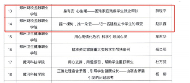 中新河南網(wǎng)3月6日電(朱夢(mèng)涵) 近日,鄭州市教育局辦公室發(fā)布了《關(guān)于公布2023年度鄭州地方高校輔導(dǎo)員工作優(yōu)秀案例評(píng)選結(jié)果的通知》(鄭教高函〔2024〕126號(hào)),《關(guān)于公布2023年鄭州地方高校優(yōu)秀輔導(dǎo)員名單的通知》(鄭教高函〔2024〕127號(hào))。其中,鄭州財(cái)稅金融職業(yè)學(xué)院薛現(xiàn)平老師撰寫的《身有安心生暖——困難家庭殘疾學(xué)生就業(yè)幫扶》、趙洪鑫老師撰寫的《搖一棵樹,推一朵云——記一名建檔立卡學(xué)生的蝶變》榮獲2023年度鄭州地方高校輔導(dǎo)員工作優(yōu)秀案例,李旋老師榮獲2023年鄭州地方高校優(yōu)秀輔導(dǎo)員。