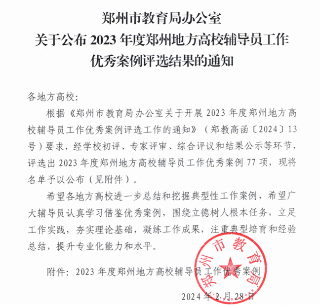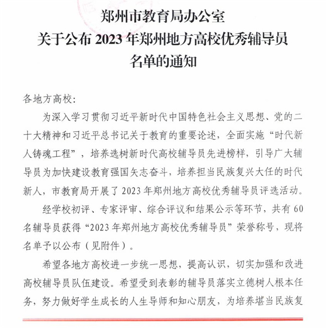 中新河南網(wǎng)3月11日電(韓園) 近日,根據(jù)鄭州市教育局辦公室發(fā)布的《關(guān)于公布2023年度鄭州地方高校輔導(dǎo)員工作優(yōu)秀案例評(píng)選結(jié)果的通知》(鄭教高函﹝2024﹞126號(hào))、《關(guān)于公布2023年鄭州地方高校優(yōu)秀輔導(dǎo)員名單的通知》(鄭教高函﹝2024﹞127號(hào))文件。鄭州軟件職業(yè)技術(shù)學(xué)院老師李田文榮獲“2023年度鄭州地方高校優(yōu)秀輔導(dǎo)員”稱(chēng)號(hào);蕩涱I(lǐng)申報(bào)的案例《褪去“功利”,沖當(dāng)先鋒》、葉海月申報(bào)的案例《護(hù)航心理健康 引領(lǐng)學(xué)業(yè)成長(zhǎng)》成功入選2023年鄭州地方高校輔導(dǎo)員工作優(yōu)秀案例。