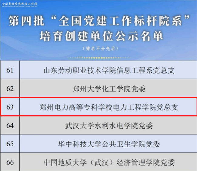 中新河南網(wǎng)3月22日電(張康博) 近日,教育部公布了第四批新時代高校黨建示范創(chuàng)建和質(zhì)量創(chuàng)優(yōu)工作遴選結(jié)果,鄭州電力高等?茖W(xué)校電力工程學(xué)院黨總支在眾多高校學(xué)院競爭中脫穎而出,成功獲批第四批“全國黨建工作標(biāo)桿院系”培育創(chuàng)建單位。