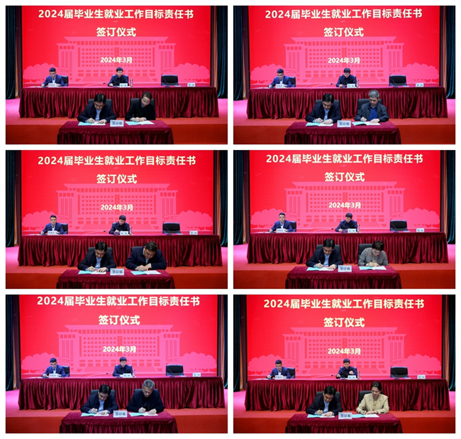 孫韜代表學(xué)校與各學(xué)院行政負(fù)責(zé)人簽訂了2024屆畢業(yè)生就業(yè)創(chuàng)業(yè)工作目標(biāo)責(zé)任書,進(jìn)一步壓緊壓實(shí)工作責(zé)任,落實(shí)落細(xì)各項(xiàng)工作措施,確保順利完成2024屆畢業(yè)生就業(yè)創(chuàng)業(yè)工作目標(biāo)任務(wù)。